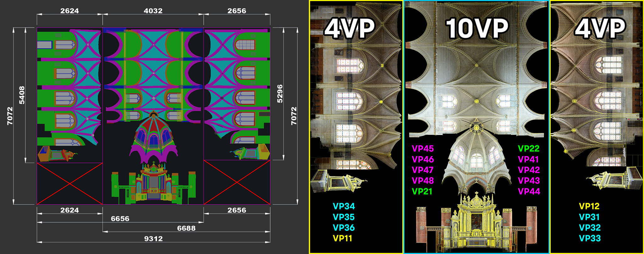 On va splitter la mire et la maquette 3d en trois parties distinctes qui seront injectés dans trois systèmes Modulo Kinetic séparés. On met bien évidement des côtes au pixel pour les découpes.