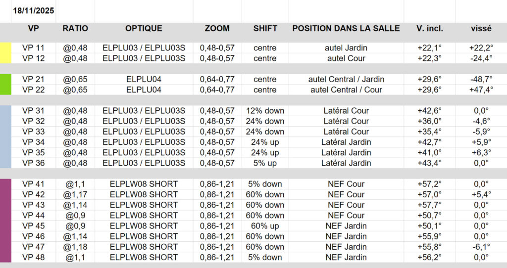 De suite le tableau des vidéo projecteurs avec le ratio, l’optique, le décentrement, la position, l’inclinaison verticale et l’assiette.
